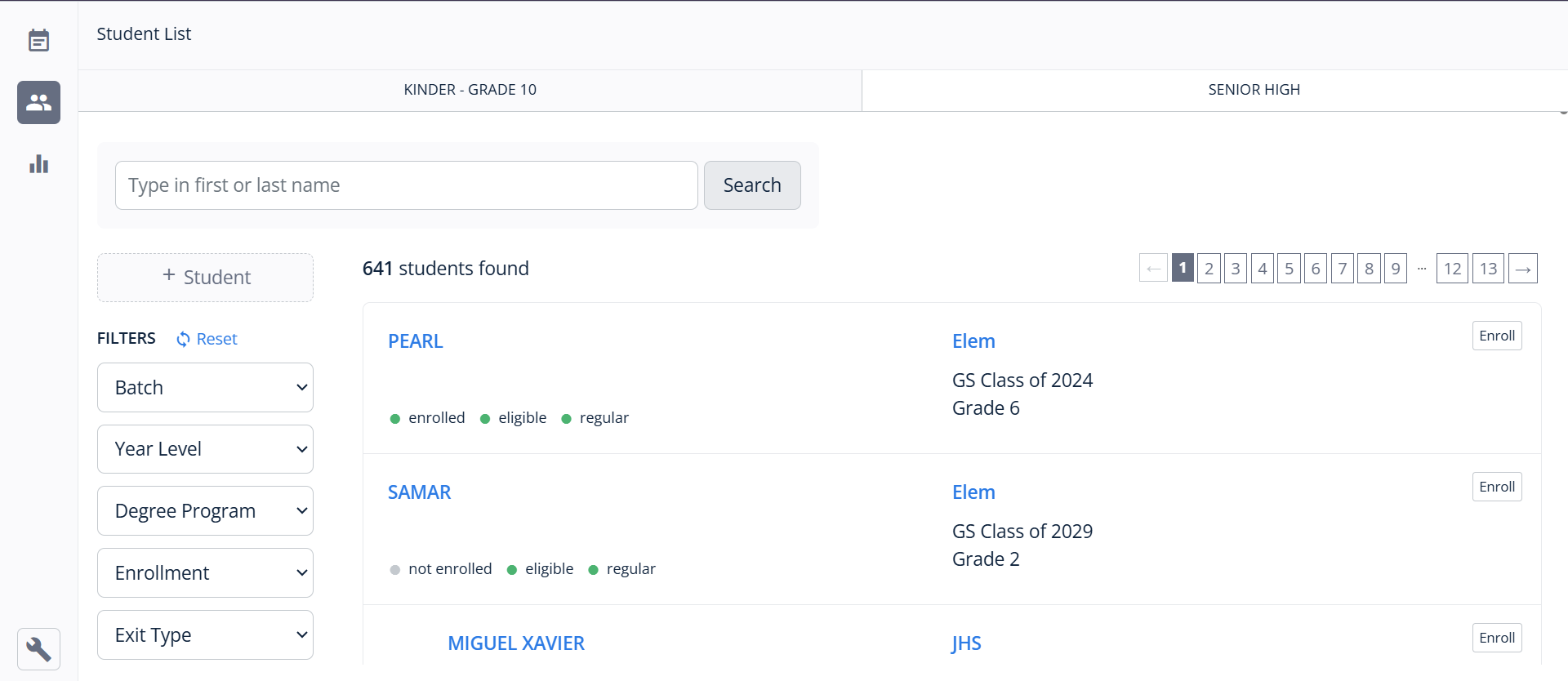 1. Use the available filters or the search field to locate the specific student.
