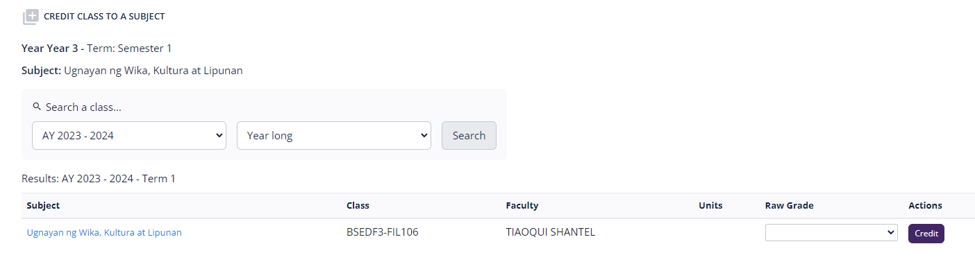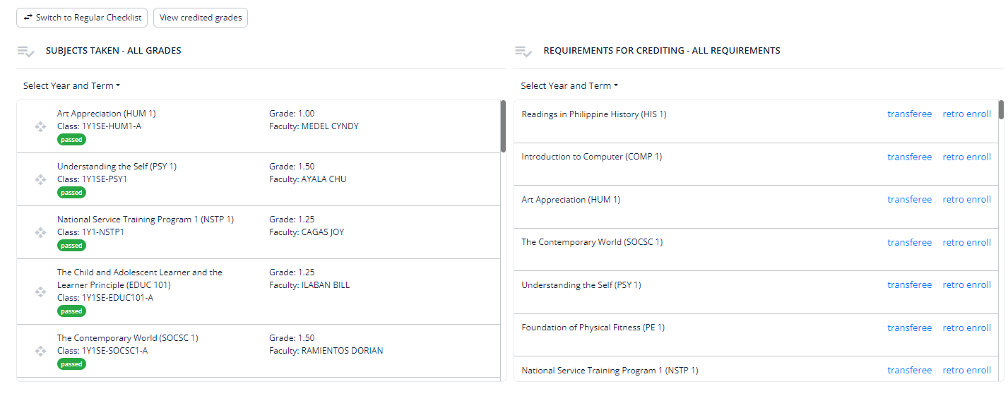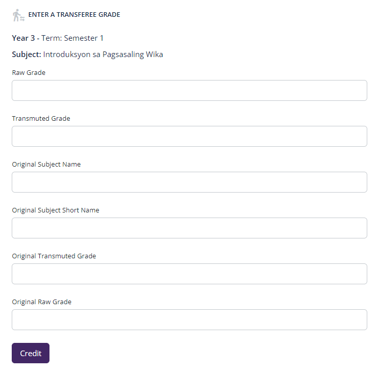 Summary: This article provides detailed instructions on how to access and use different interfaces for crediting grades in a student's academic record, including both retroactive and transferee grade entries. For retro-enrolling students instead (i.e. go through the process of enlisting and assessing student fees for classes taken on previous terms or academic years), see Enrolling students to classes of previous academic years or terms.