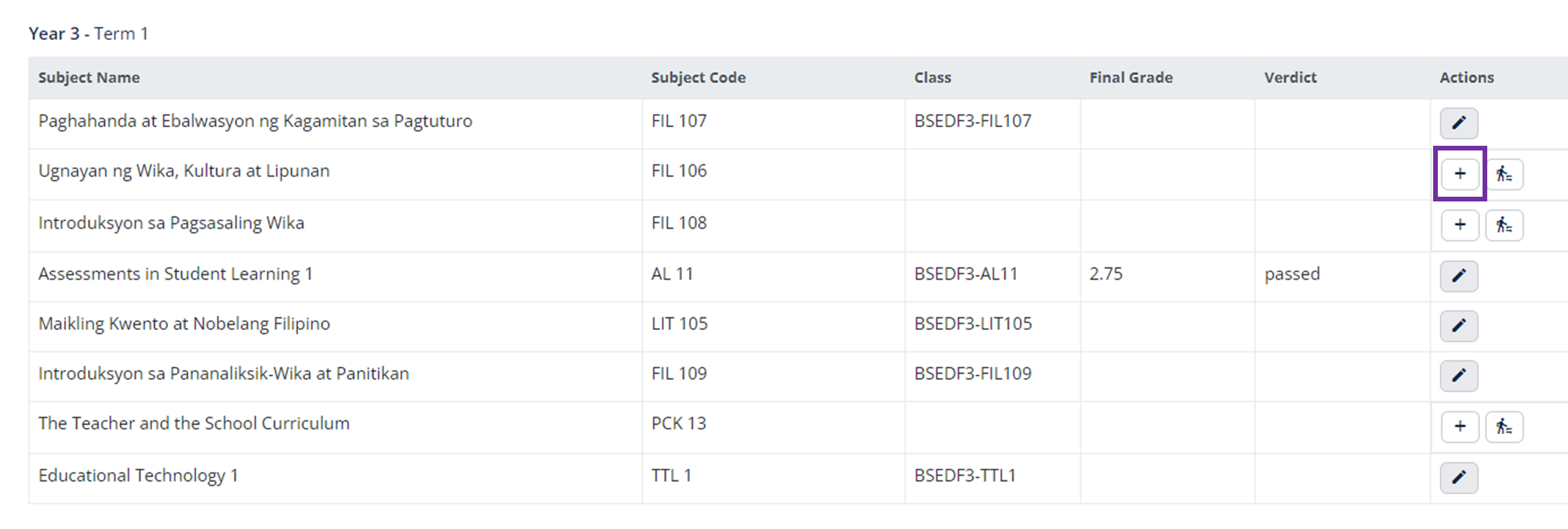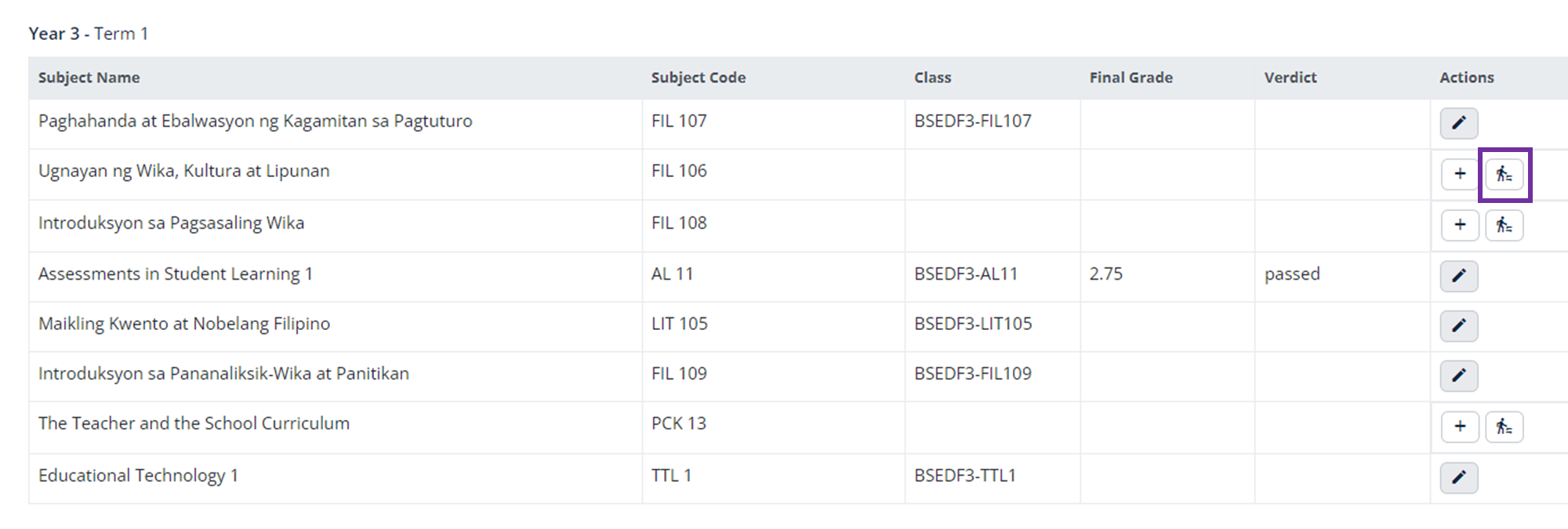 • From the list of student program subjects, click the transferee icon next to the relevant subject.